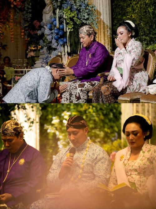 Tommy Soeharto mengenakan beskap berwarna burgundy, sementara Darma Mangkuluhur bersimpuh di hadapan kedua orang tuanya untuk memohon restu sebelum melangkah ke jenjang pernikahan.