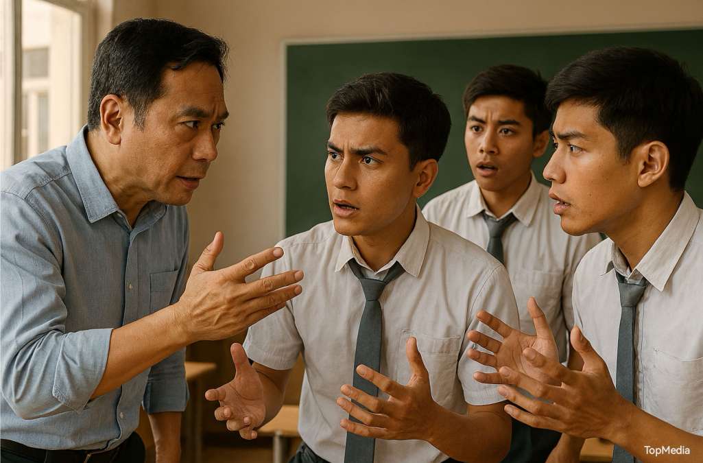 Kejadian ini berlangsung di lingkungan sekolah saat jam belajar dan memicu perdebatan publik mengenai etika guru dan siswa di ruang pendidikan.